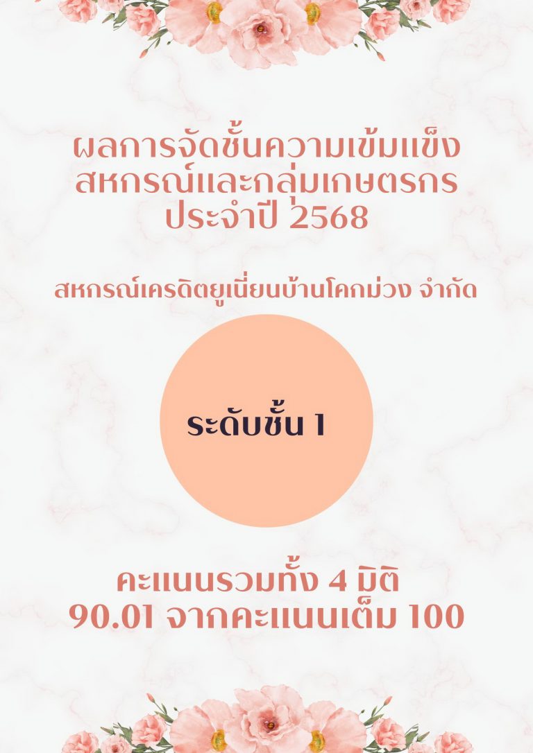 ผลการจัดชั้นความเข้มแข็งของสหกรณ์เครดิตยูเนี่ยนบ้านโคกม่วง จำกัด ตามเกณฑ์การประเมินของกรมส่งเสริมสหกรณ์ประจำปี 2568