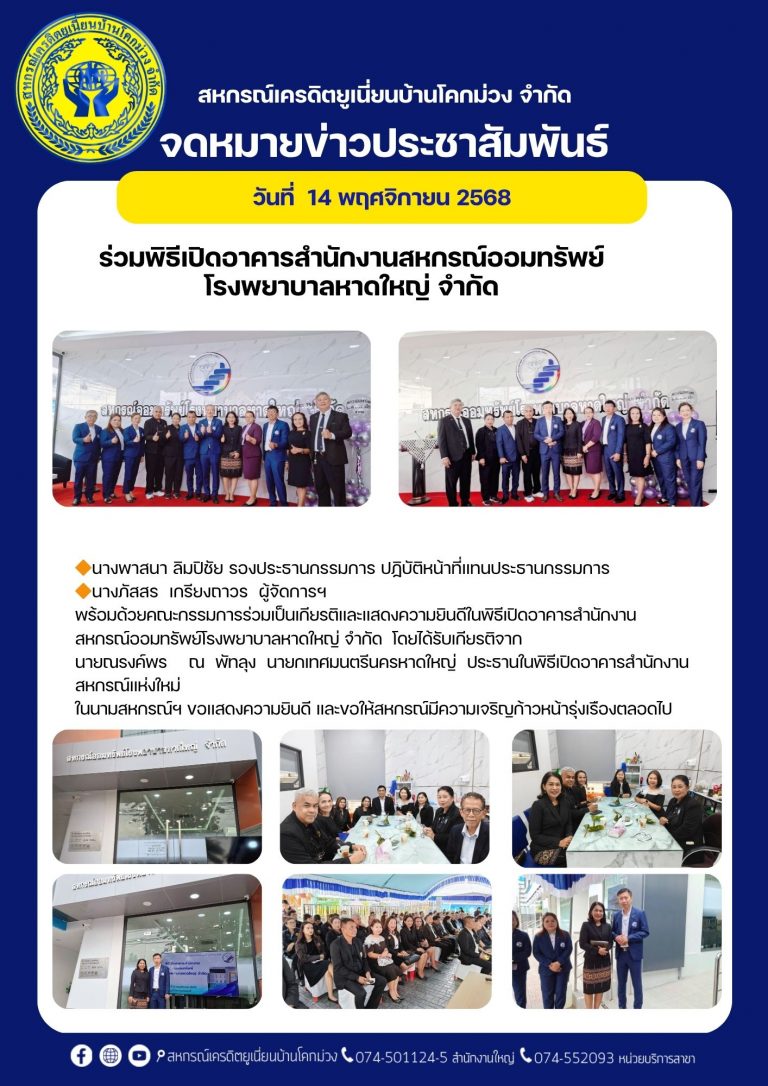 ประกาศสหกรณ์เครดิตยูเนี่ยนบ้านโคกม่วง จำกัด เรื่อง การขยายระยะเวลาการทำธุรกรรมของสมาชิก28 พฤศจิกายน 25682 ธันวาคม 2025