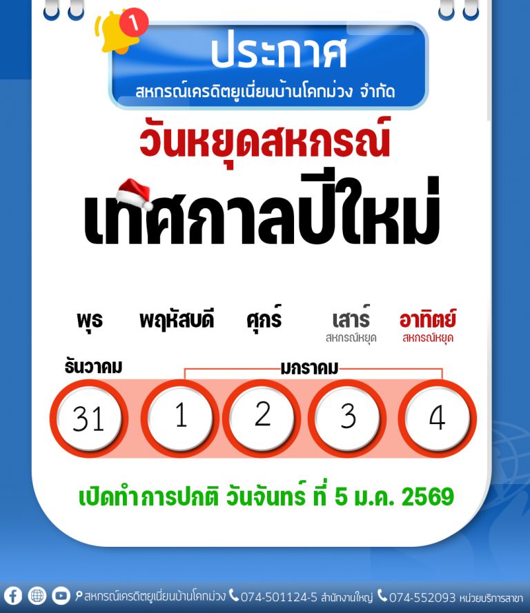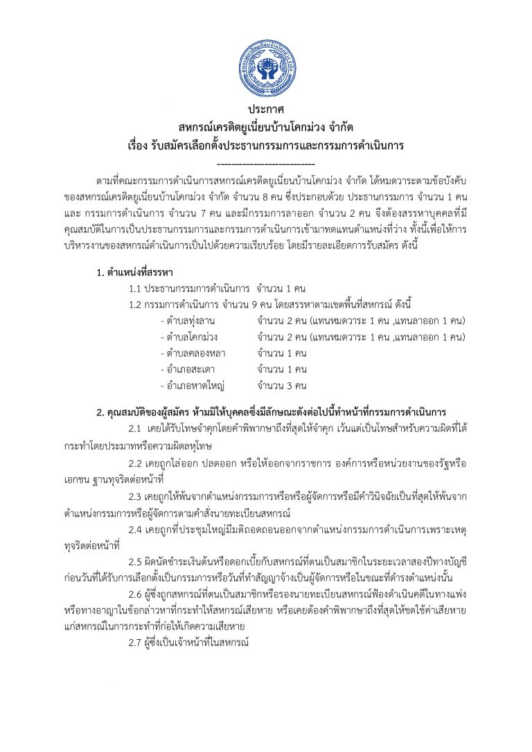 ประกาศ สหกรณ์เครดิตยูเนี่ยนบ้านโคกม่วง จำกัด การรับสมัครเลือกตั้งประธานกรรมการและกรรมการดำเนินการ14 มกราคม 256914 มกราคม 2026