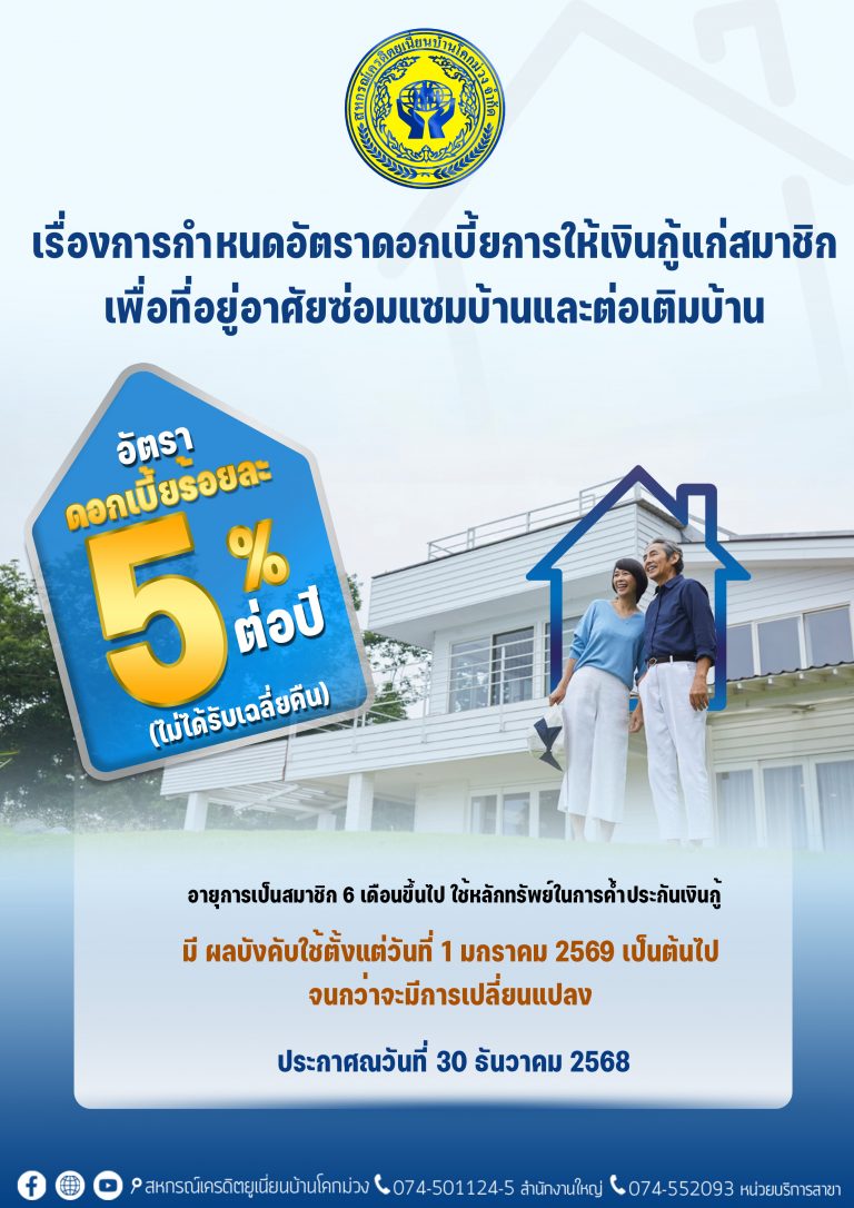 การกำหนดอัตราดอกเบี้ยการให้เงินกู้แก่สมาชิกเพื่อที่อยู่อาศัยซ่อมแซมบ้านและต่อเติมบ้าน12 มกราคม 256912 มกราคม 2026