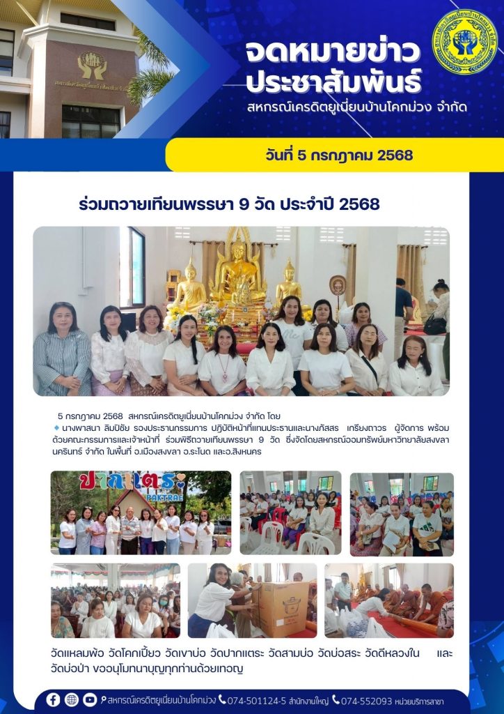 นางภัสสร เกรียงถาวร ผู้จัดการ พร้อมด้วยคณะกรรมการและเจ้าหน้าที่ ร่วมถวายเทียนพรรษา 9 วัด ประจำปี 2568 ร่วมกับสหกรณ์ออมทรัพย์มหาวิทยาลัยสงขลานครินทร์ ในพื้นที่ อ.เมืองสงขลา อ.ระโนด และ อ.สิงหนคร (วัดแหลมพ้อ วัดโคกเปี้ยว วัดเขาบ่อ วัดปากแตระ วัดบ่อสระ วัดดีหลวงใน วัดบ่อป่า ขออนุโมทนาบุญทุกท่าน