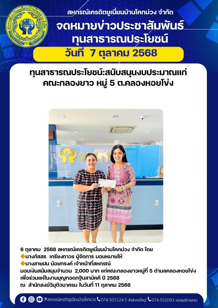 ทุนสาธารณประโยชน์:สนับสนุนงบประมาณแก่คณะกลองยาว หมู่ที่ 5 ต.คลองหอยโข่ง