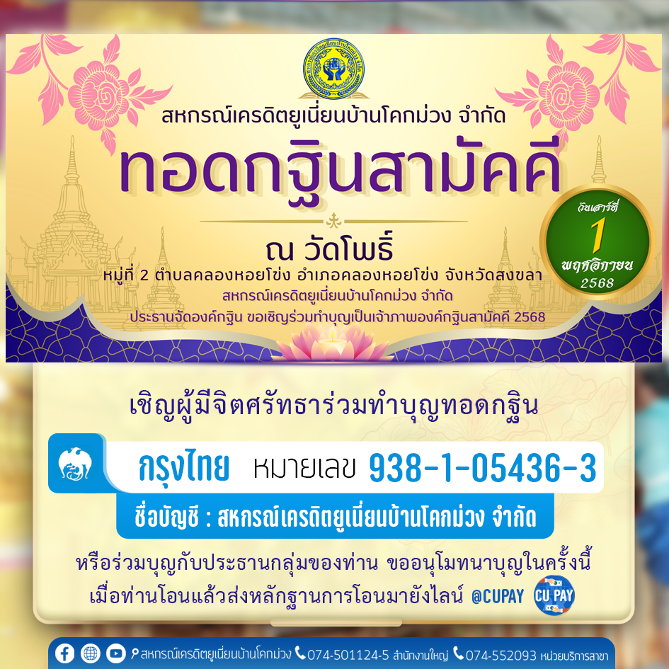 สหกรณ์เครดิตยูเนี่ยนบ้านโคกม่วง จำกัด เชิญผู้มีจิตศรัทธาร่วมทำบุญทอดกฐินสามัคคี ณ วัดโพธิ์ หมู่ที่ 2 ต. คลองหอยโข่ง อ.คลองหอยโข่ง จ.สงขลา