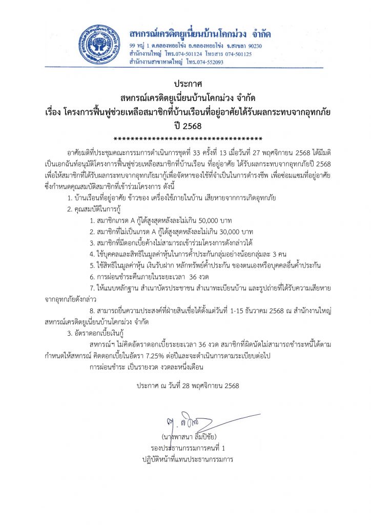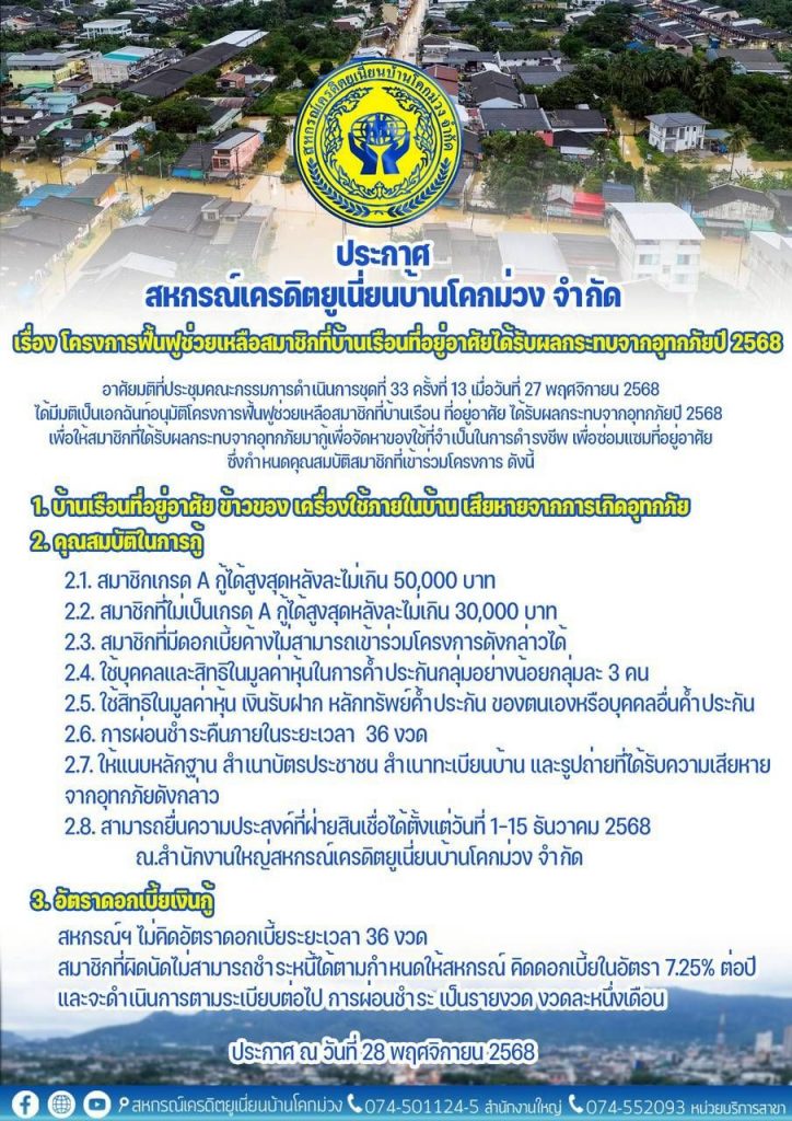 อาศัยมติที่ประชุมคณะกรรมการดำเนินการชุดที่ 33 ครั้งที่ 13 เมื่อวันที่ 27 พฤศจิกายน 2568 ได้มีมติเป็นเอกฉันท์อนุมัติโครงการฟื้นฟูช่วยเหลือสมาชิกที่บ้านเรือน ที่อยู่อาศัย ได้รับผลกระทบจากอุทกภัยปี 2568 เพื่อให้สมาชิกที่ได้รับผลกระทบจากอุทกภัยมากู้เพื่อจัดหาของใช้ที่จำเป็นในการดำรงชีพ เพื่อซ่อมแซมที่อยู่อาศัย