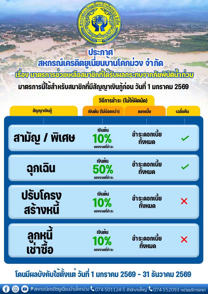 อาศัยมติที่ประชุมคณะกรรมการดำเนินการชุดที่ 33 ครั้งที่ 14 เมื่อวันที่ 12 ธันวาคม 2568 ได้มีมติกำหนดมาตรการช่วยเหลือสมาชิกที่ได้ผลกระทบจากภัยพิบัติน้ำท่วม ดังนี้