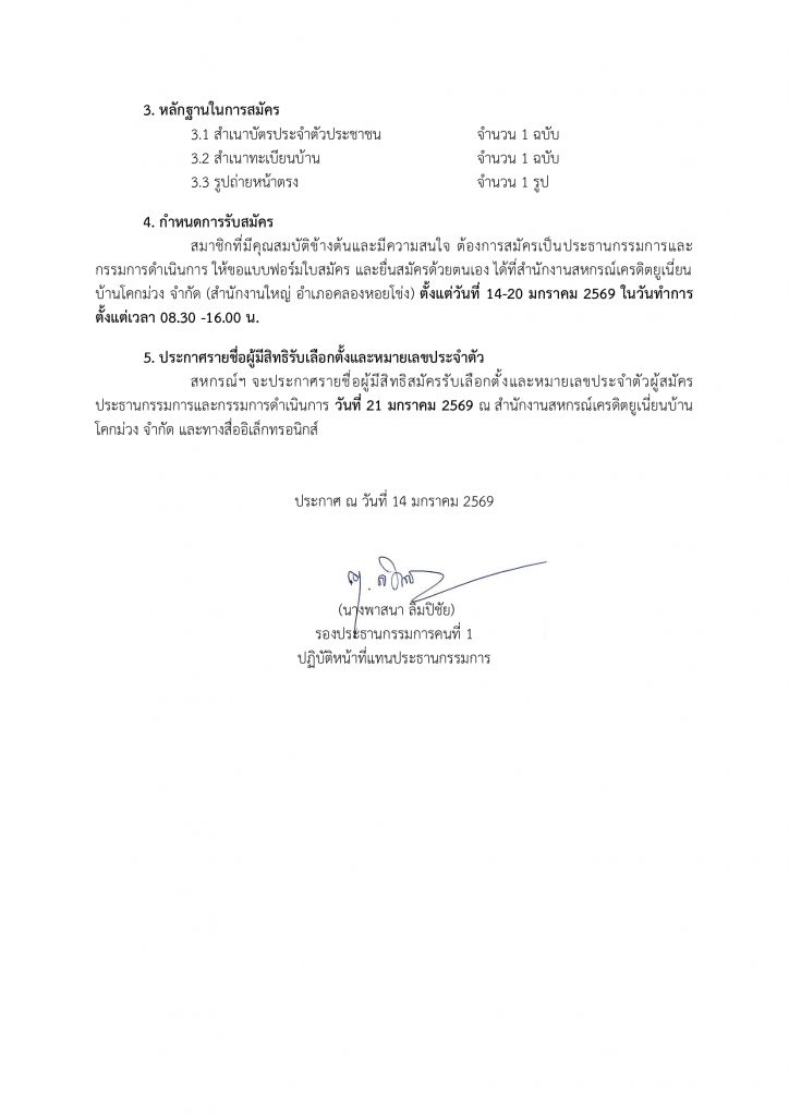 #ประกาศรายชื่อผู้มีสิทธิรับเลือกตั้งและหมายเลขประจำตัว วันที่ 21 มกราคม 2569 ที่สำนักงานสหกรณ์และทางสื่ออิเล็คทรอนิกส์