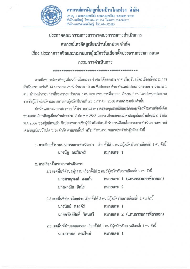 ตามที่สหกรณ์เครดิตยูเนี่ยนบ้านโคกม่วง จำกัด ได้ออกประกาศ เรื่องรับสมัครเลือกตั้งกรรมการดำเนินการ ลงวันที่ 14 มกราคม 2569 ที่ผ่านมานั้น