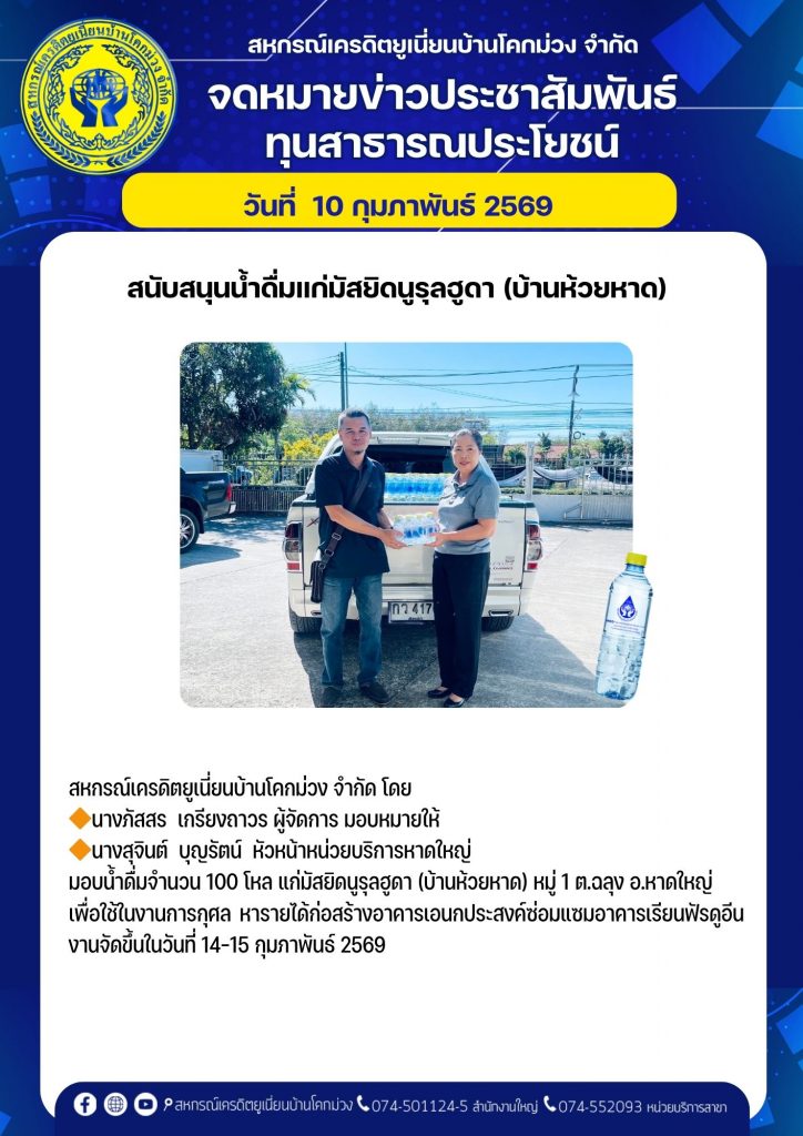 มอบน้ำดื่มจำนวน 100 โหล แก่มัสยิดนูรุลฮูดา (บ้านห้วยหาด) หมู่ 1 ต.ฉลุง อ.หาดใหญ่