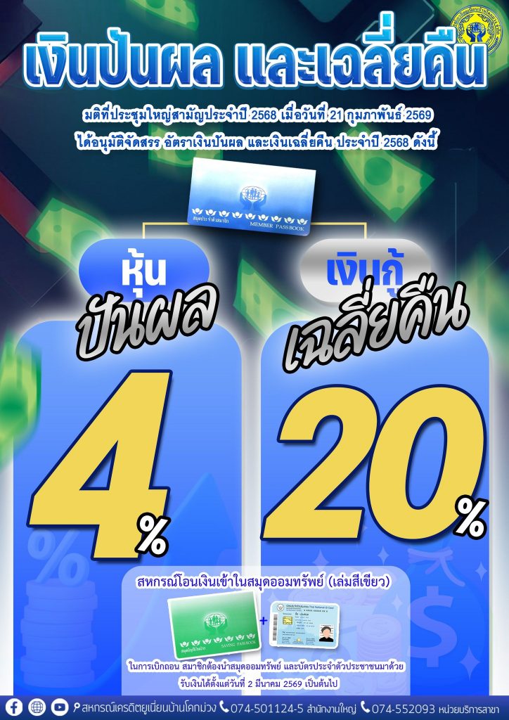 มติที่ประชุมใหญ่สามัญประจำปี 2568 เมื่อวันที่ 21 กุมภาพันธ์ 2569 ได้อนุมัติจัดสรรอัตราเงินปันผลและเงินเฉลี่ยคืนประจำปี 2568 โดยสหกรณ์โอนเงินปันผลเข้าบัญชีออมทรัพย์ทั่วไป (เล่มเขียว)