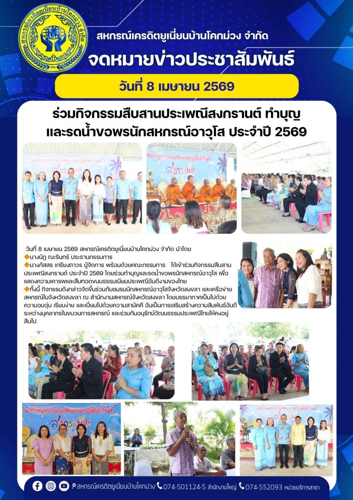 ทั้งนี้ กิจกรรมดังกล่าวจัดขึ้นร่วมกับชมรมนักสหกรณ์อาวุโสจังหวัดสงขลา และเครือข่ายสหกรณ์ในจังหวัดสงขลา ณ สำนักงานสหกรณ์จังหวัดสงขลา โดยบรรยากาศเป็นไปด้วยความอบอุ่น เรียบง่าย และเปี่ยมไปด้วยความสามัคคี อันเป็นการเสริมสร้างความสัมพันธ์อันดีระหว่างบุคลากรในขบวนการสหกรณ์ และร่วมกันอนุรักษ์วัฒนธรรมประเพณีไทยให้คงอยู่สืบไป